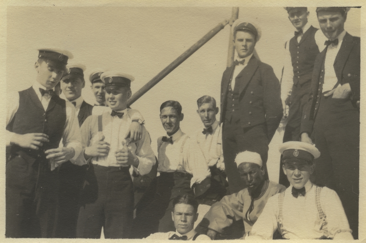 Svenska sjöofficerare. Den mörke mannen i nedre h bildfält gör det troligt att bilden tagits då Berger deltog i pansarkryssaren FYLGIAs långresa 1925-1926 och 1927. Den första av dessa gick till bl a Alexandria och Tunis och den andra till Alger, vid vilken av resorna (om någon av dessa) bilden tagits har inte kunnat fastslås. Person nummer fyra från v förefaller vara fänrik Karl Gustaf Bertil Norman (jfr Fo229405A och Fo229407A).