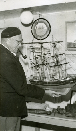 Svanshalls Sjöfartsmuseum. Museets förestånfdare kapten Carl G. Wallin med modellen av en fullriggare Carolina (se foto av modellen). Fullriggaren Carolina. Tillhörde som votivskepp Jonstorps kyrka men togs ner vid en restaurering av kyrkan 1888 och återlämnades till släkten Smith i Jonstorp (och) som tidigare skänkt den till kyrkan. 1959. hittades vraket av modellen på en vind hos släkten Smith. Undermasterna fanns då kvar jämte någon av märsstängerna och ett par rår. Den skänktes till Svanshalls sjöfartsmuseum där kapten C. G. Wallin restaurerade den till dess nuvarande skick. Foto i juni 1962. Skåne, Malmöhus län, Jonstorps socken, Svanshall.