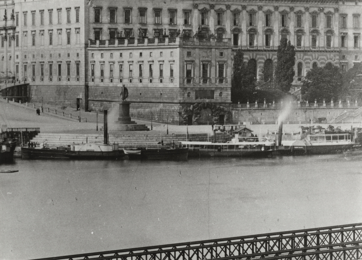 Hjulångaren WERMDÖ (till vänster) vid Slottet, Skeppsbron, Stockholm. Till höger hjulångaren JACOB BAGGE.