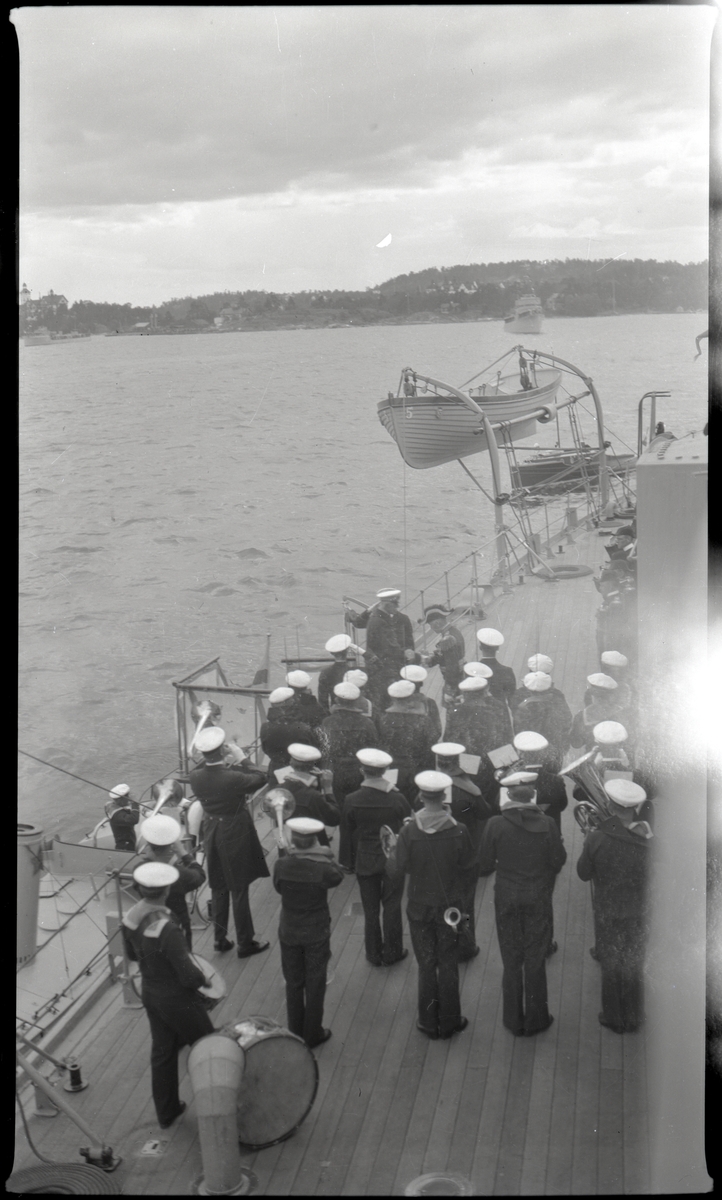 Kung Gustaf V anländer med motorbarkass till pansarskepp (sannolikt SVERIGE) och hälsas av blåsorkester och officerare i paraduniform. Tid, plats och sammanhang okända. Se även Fo229269C från samma tillfälle.