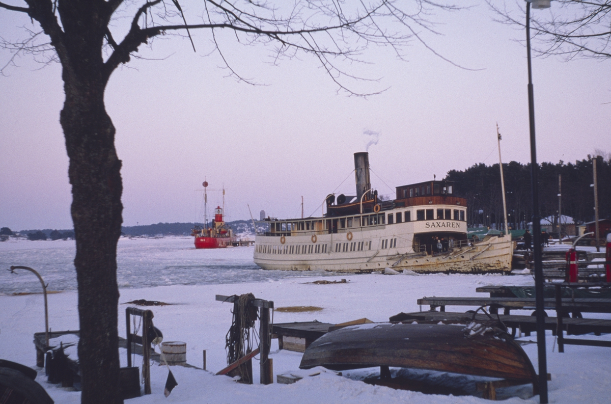S/S SAXAREN vid brygga i Sandhamn. I bakgrunden fyrskeppet ALMAGRUNDET.