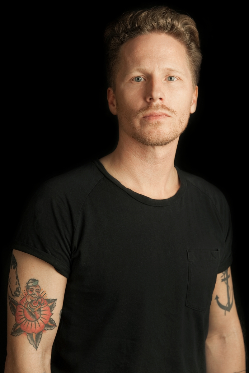 Porträtt och tatueringar på Johan Ray Pederson till utställning Tro hopp & kärlek på Sjöhistoriska.