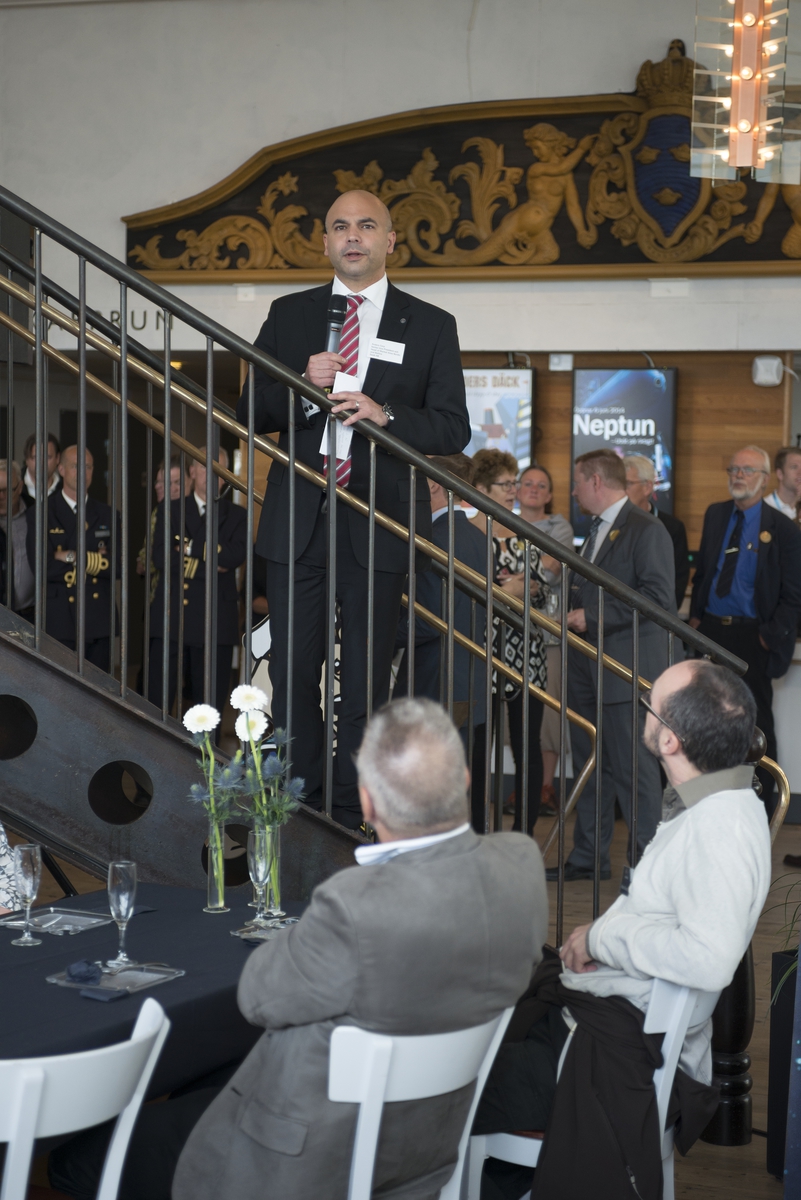 Den för specialinbjudna invigningsdagen av ubåtshallen tillhörande Marinmuseum. Anders Carp från SAAB AB håller tal.