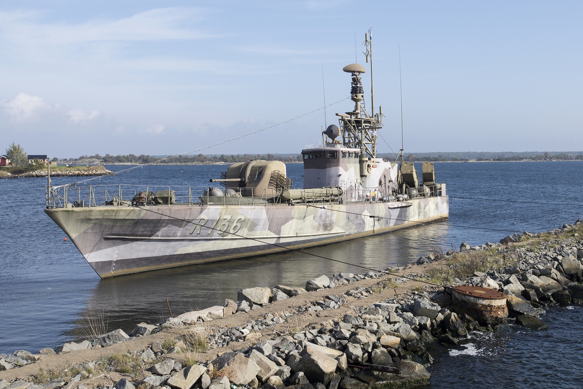 Musei robotbåten VÄSTERVIK har bogserats ifrån Marinmuseum i Karlskrona till Hasslö båtvarv för renovering/ommålning.