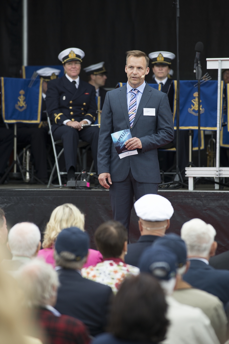 Den för specialinbjudna invigningsdagen av ubåtshallen tillhörande Marinmuseum. Museichefen Richard Bauer håller tal. Marinens musikkår spelar.