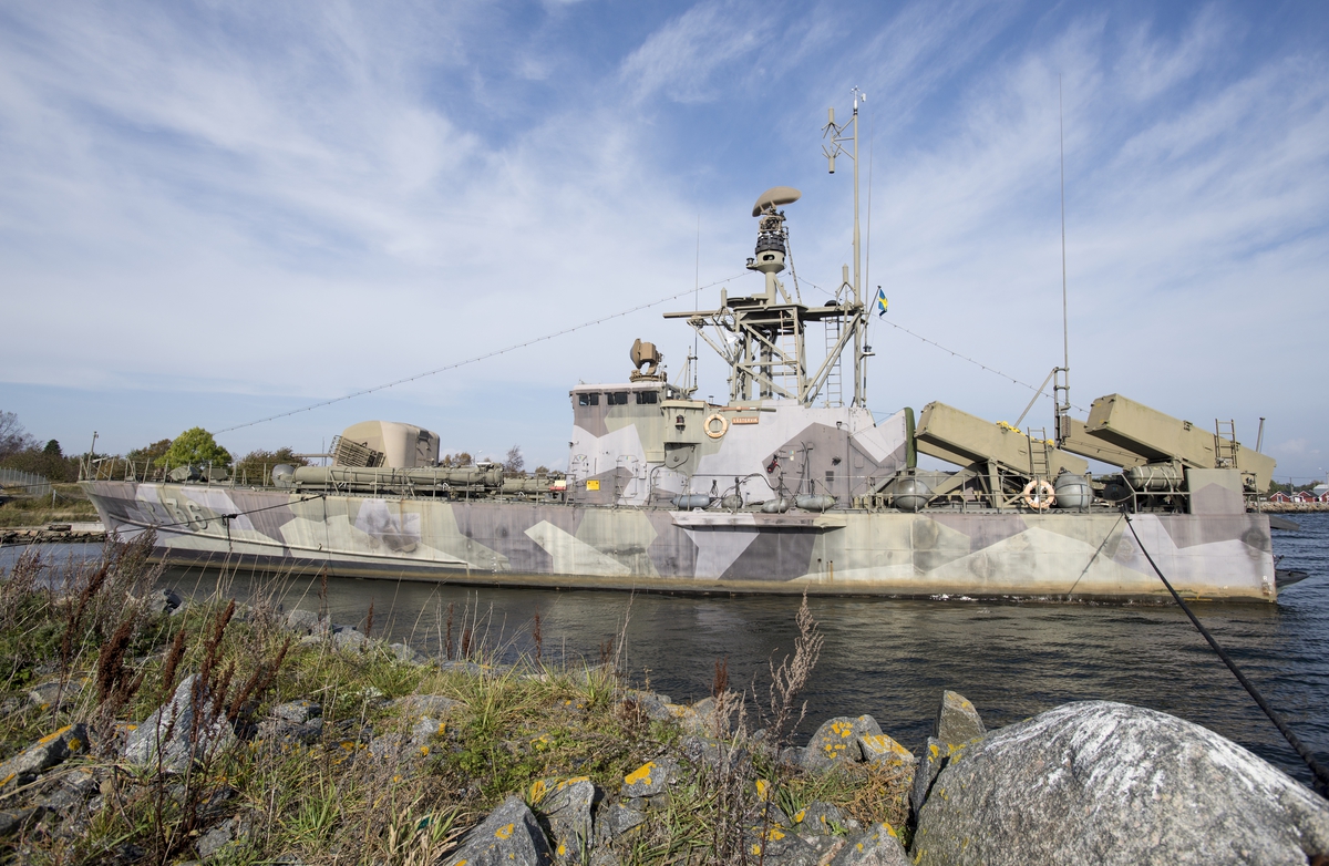 Musei robotbåten VÄSTERVIK har bogserats ifrån Marinmuseum i Karlskrona till Hasslö båtvarv för renovering/ommålning.