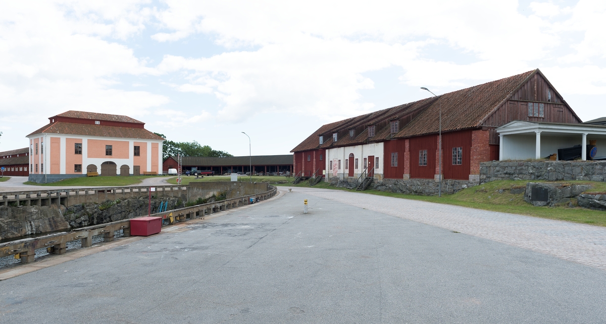 Fotodokumentation av byggnader på Lindholmen i Karlskrona. Vänster sida: Polhemsdockan framför repslagarebanans nordvästra banhuvud. Granknäskjulet eller senare benämning knäskjulet. I denna byggnad handskades det med "knä" det var naturvuxna krokiga detaljer som användes vid skeppsbyggandet. Framför granknäskjulets gavelsida ligger galjonslunden med flera stävprydnader.