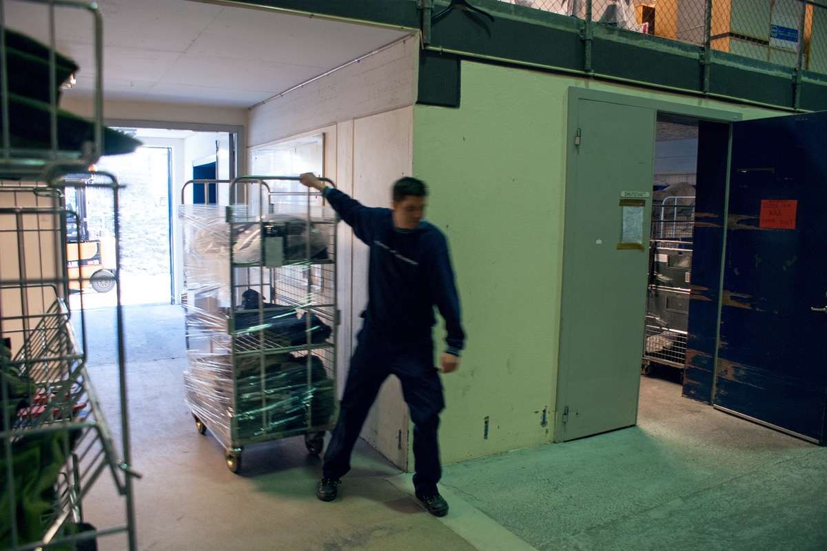 Stefan Andersson drar in tvätt i förrådet som Mark håller på att lossa.