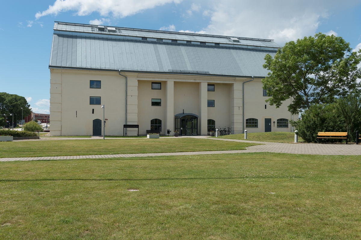 Fotodokumentation av byggnader på Lindholmen i Karlskrona. Finska kyrkan. Byggnaden uppfördes i slutet av 1690-talet som tjärbadsstuga för rep. På 1720-talet förändrades byggnaden till inventariekammare för skeppsinventarier. Åren 2006-2007 genomfördes en omfatande om- och nygestaltning både in- och utvändigt av byggnaden. Östra långsidan av byggnaden.