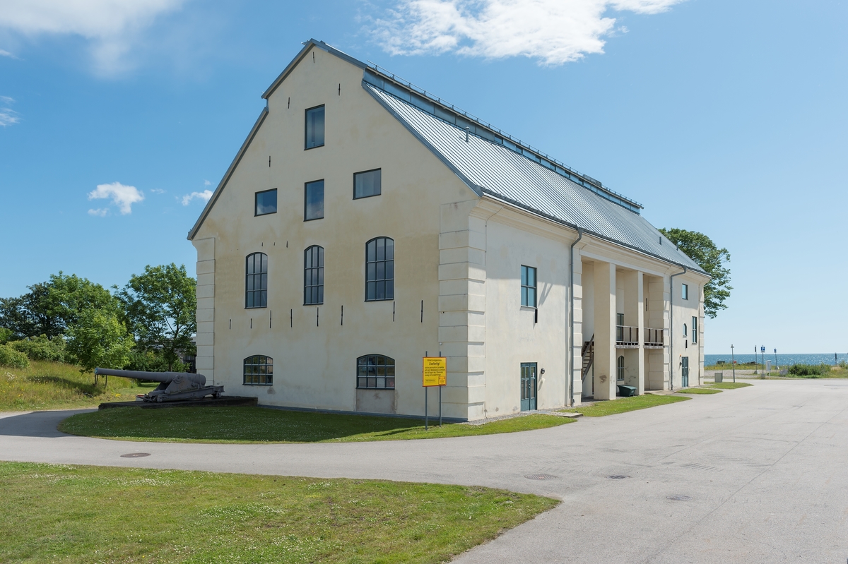 Fotodokumentation av byggnader på Lindholmen i Karlskrona. Finska kyrkan. Byggnaden uppfördes i slutet av 1690-talet som tjärbadsstuga för rep. På 1720-talet förändrades byggnaden till inventariekammare för skeppsinventarier. Åren 2006-2007 genomfördes en omfatande om- och nygestaltning både in- och utvändigt av byggnaden. Östra långsidan och västra gaveln av byggnaden.