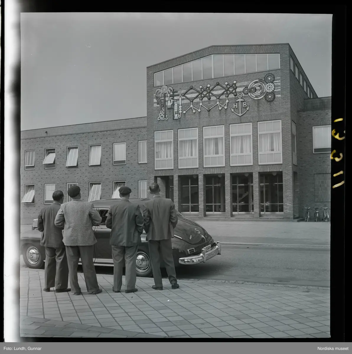 Fyra män står ute på gatan och betraktar Höganäs AB laboratoriebyggnads fasadutsmyckning.