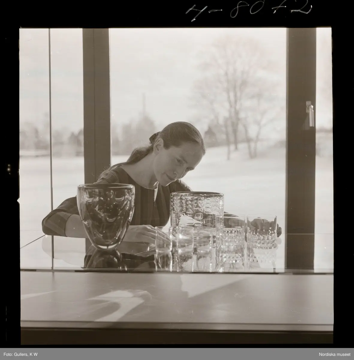 1713 Orrefors Glasbruk Ingeborg Lundin. Med sina formgivna glasföremål uppställda på ett glasbord.