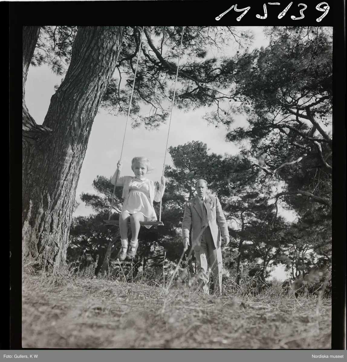 1717/K Istanbul allmänt. Ett barn gungar i en gunga upphängd i ett träd. En man står bakom och puttar på.