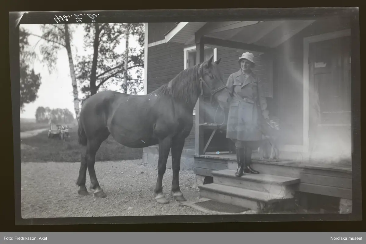 En kvinna står på farstubro och håller i en häst och en hund.