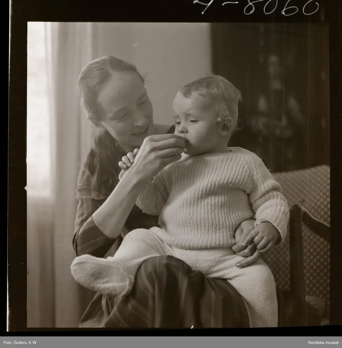 Titel: 1713 Orrefors Glasbruk Ingeborg Lundin. Sittandes i en fåtölj med ett litet barn i famnen.