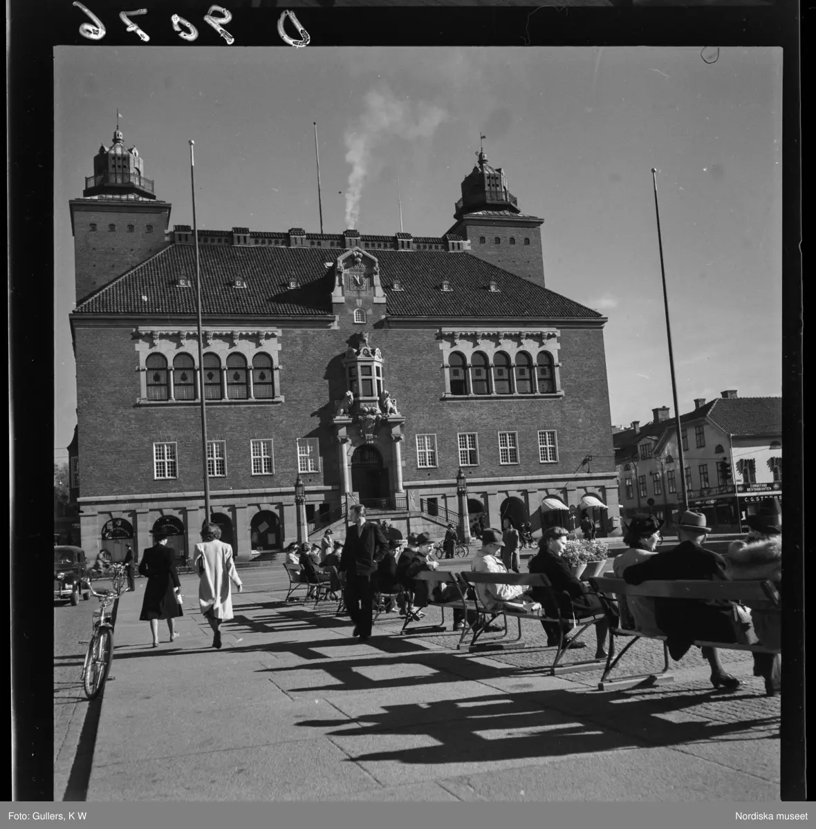 Borås. Människor sitter framför Rådhuset på Stora torget.
