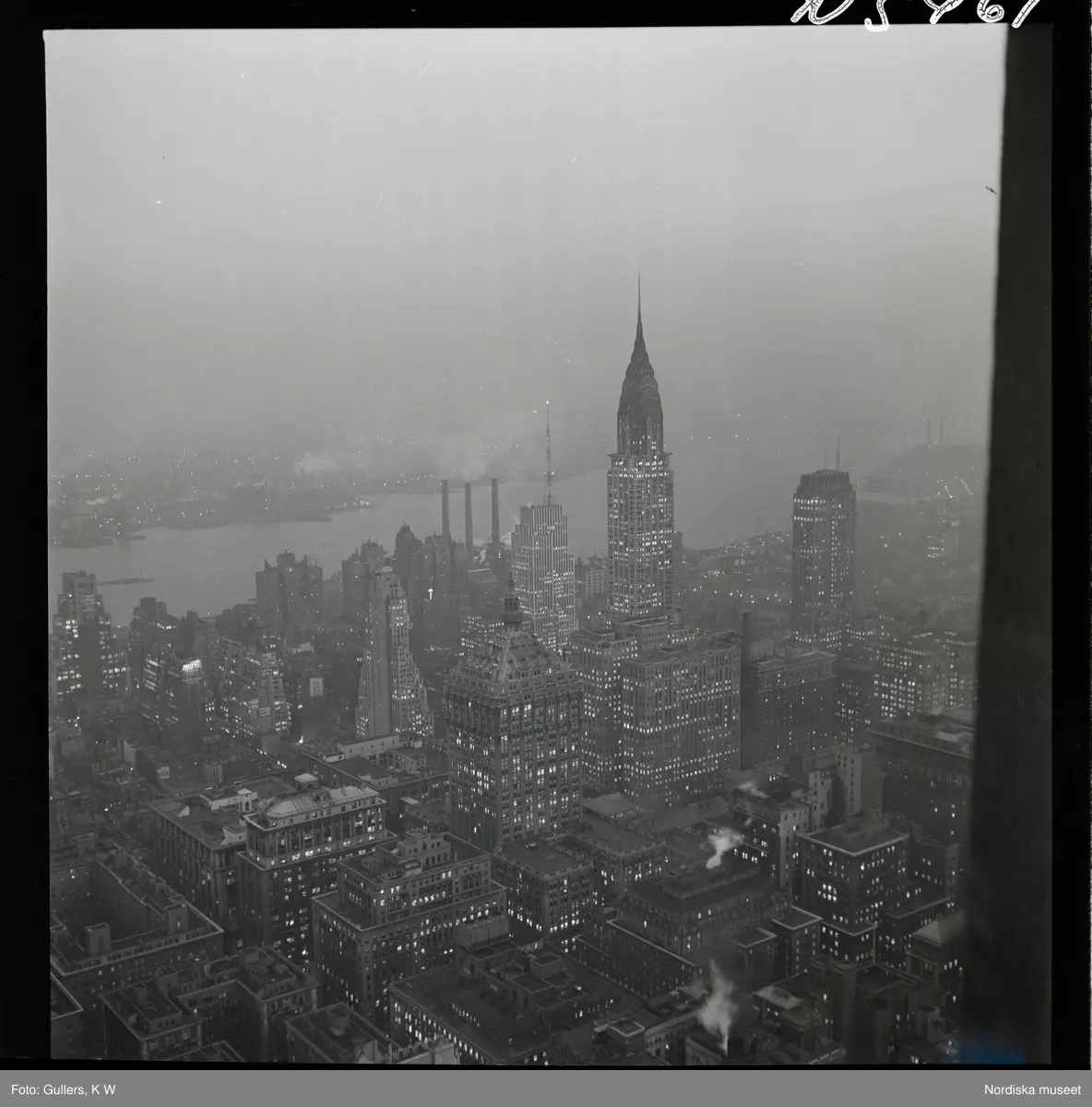 1690 New York allmänt (N.Y. Herald Tribune). Kvälls-/ nattbild. Skyskrapor. Chrysler building.