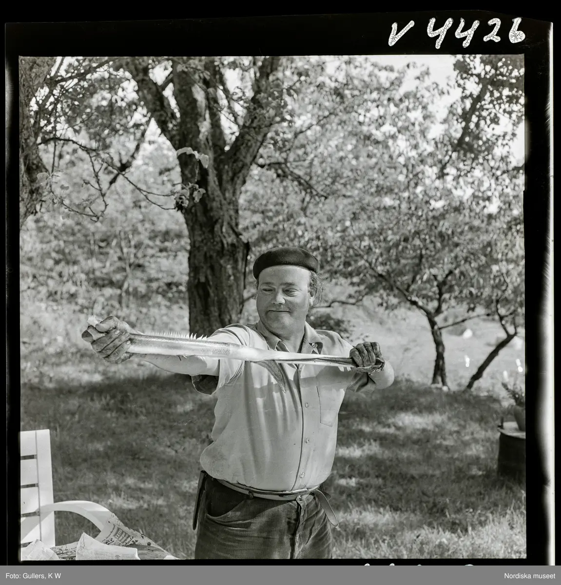 Stieg Trenter drar av ett ålskinn. Gåtebo, Gryts skärgård, Östergötland.