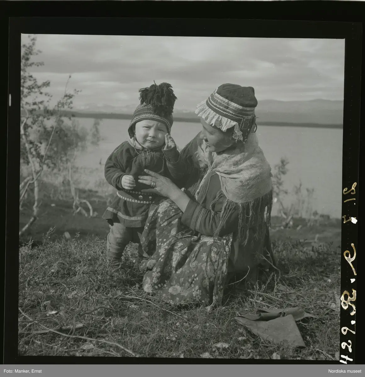 Pojken Lars-Anders med sin mamma Margareta Utsi (f. Nutti). Vaisaluokta i Jokkmokks socken.