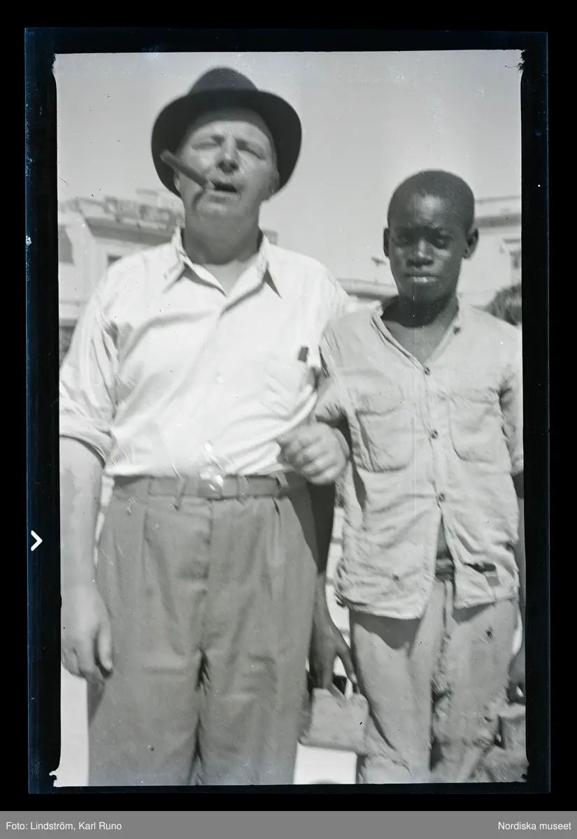 En man i hatt och med cigarr i mungipan håller armkrok med en ung man.