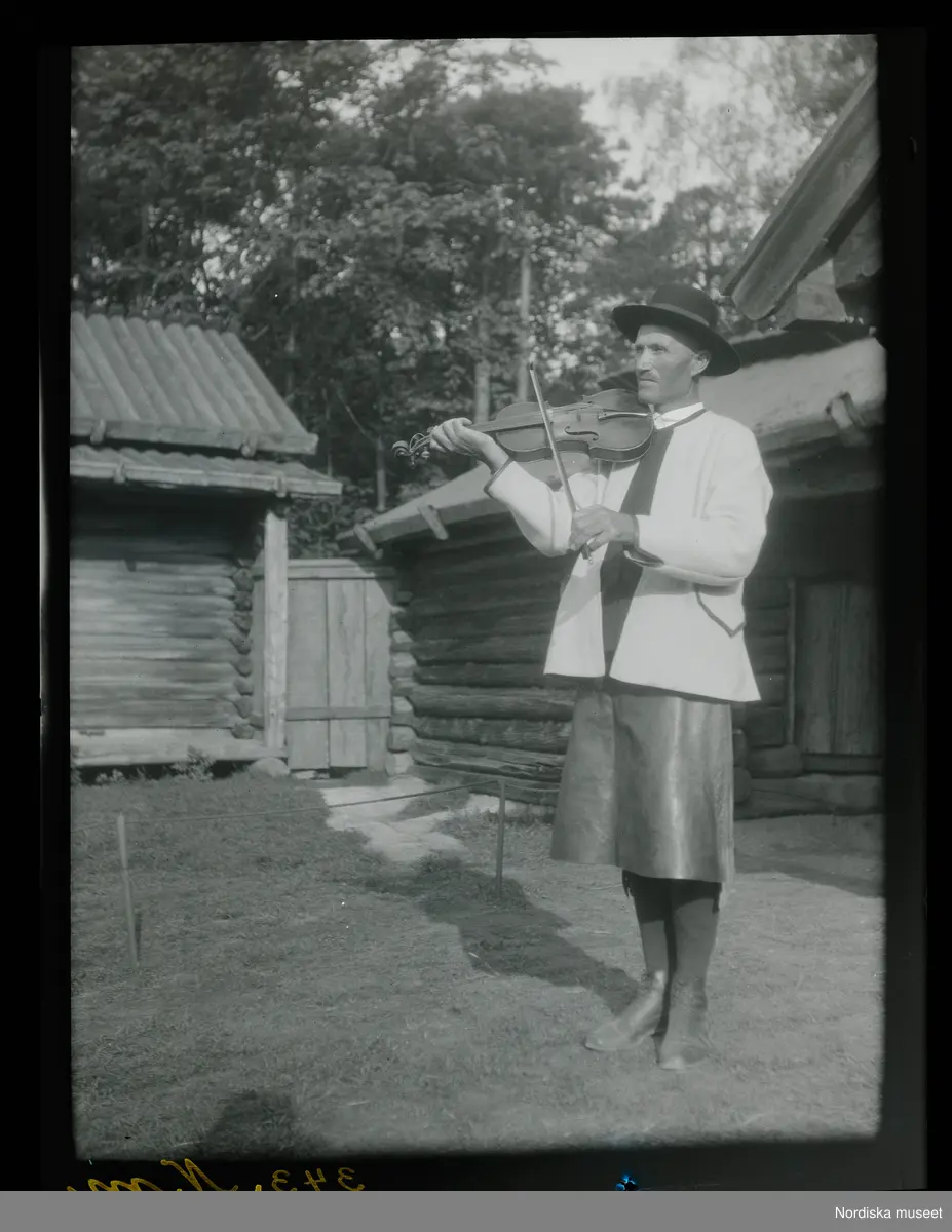 Man i folkdräkt spelar fiol. Skansen, Stockholm.