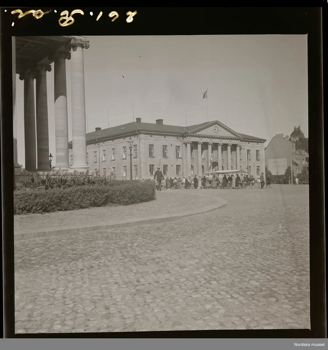 Markand framför Rådhuset på Stortorget, Karlskrona. Trefaldighetskyrkan skymtas i förgrunden.