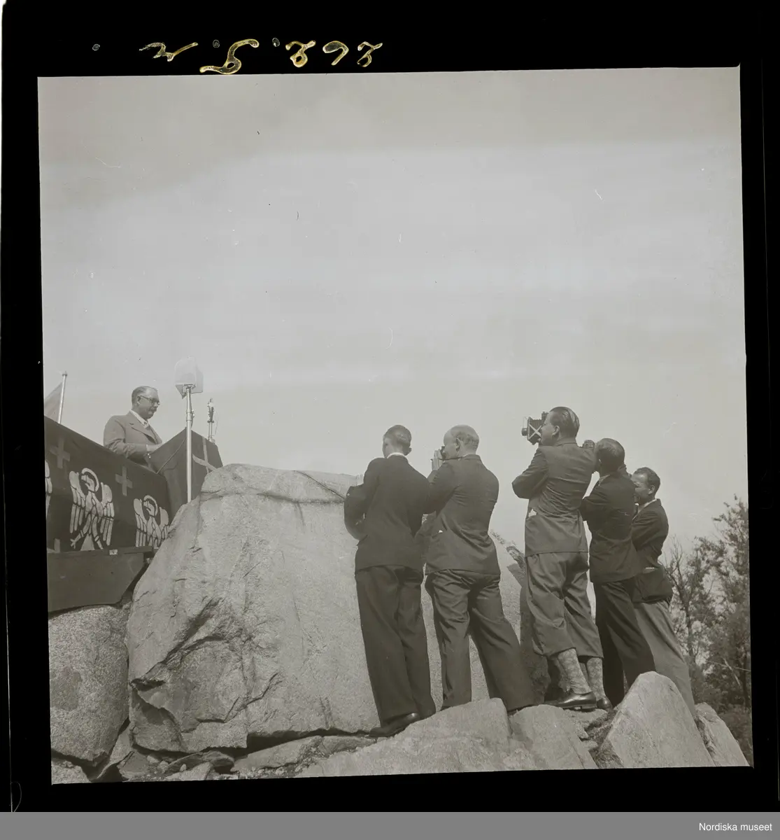Fotografer framför en man i talarstol. Skansen, Stockholm.