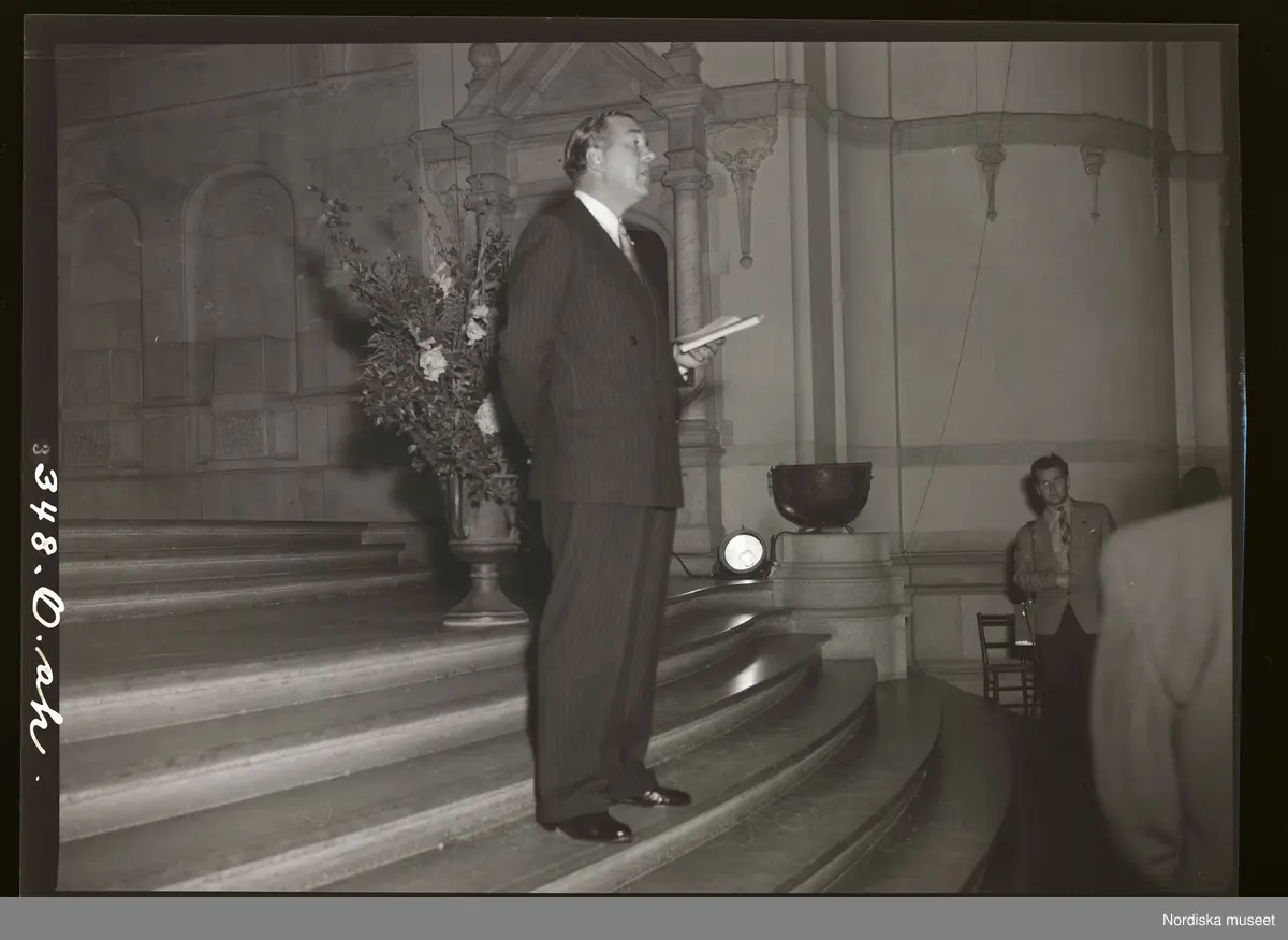 En man håller tal på trappan framför Gustav Vasa i stora hallen, Nordiska museet.