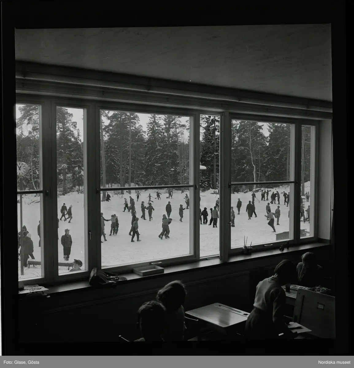 Elever i ett klassrum. Genom fönstret syns andra alever som leker i snön under sin rast.