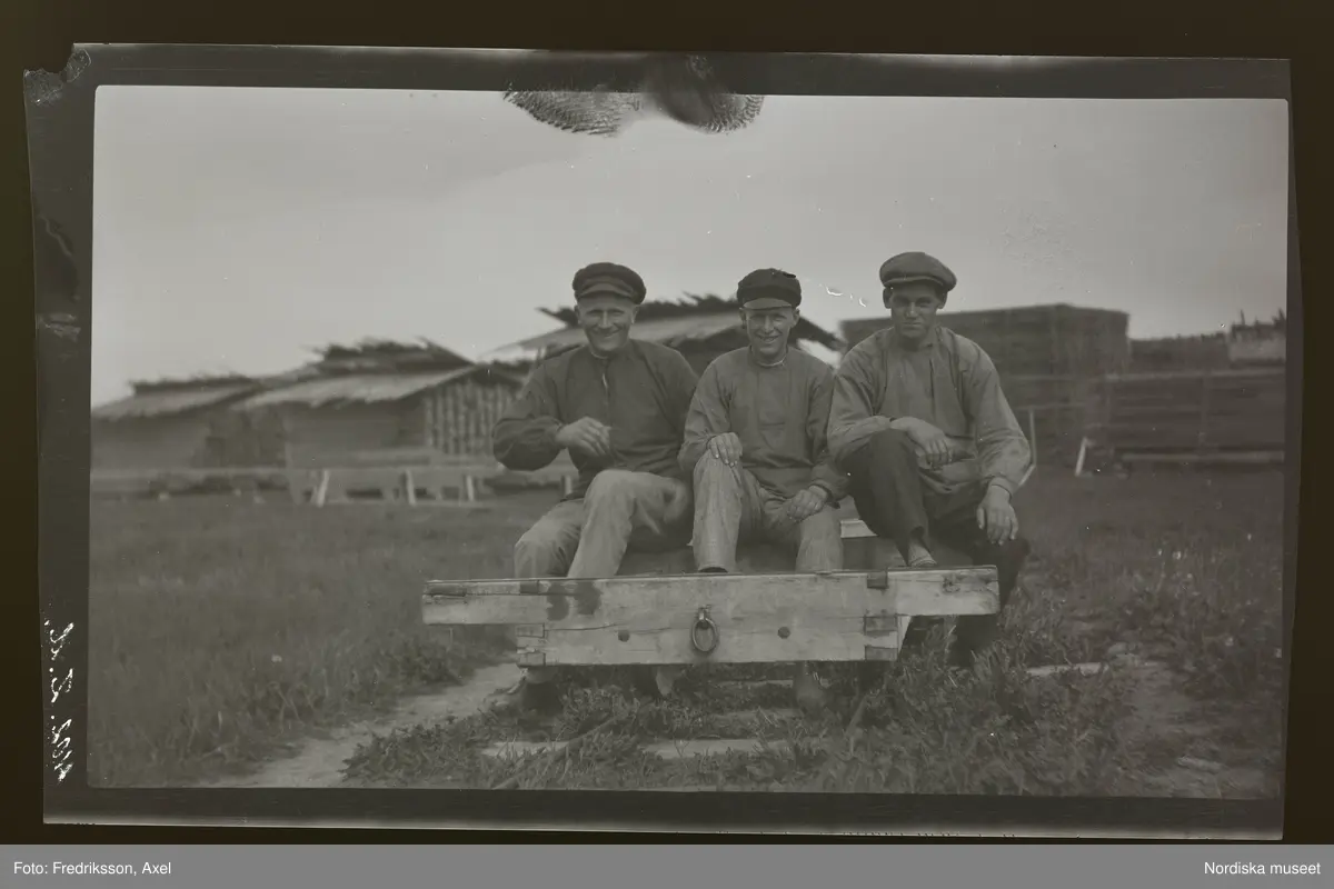 Tre arbetare sitter på en dressin. Bakom dem syns högar med staplat virke.