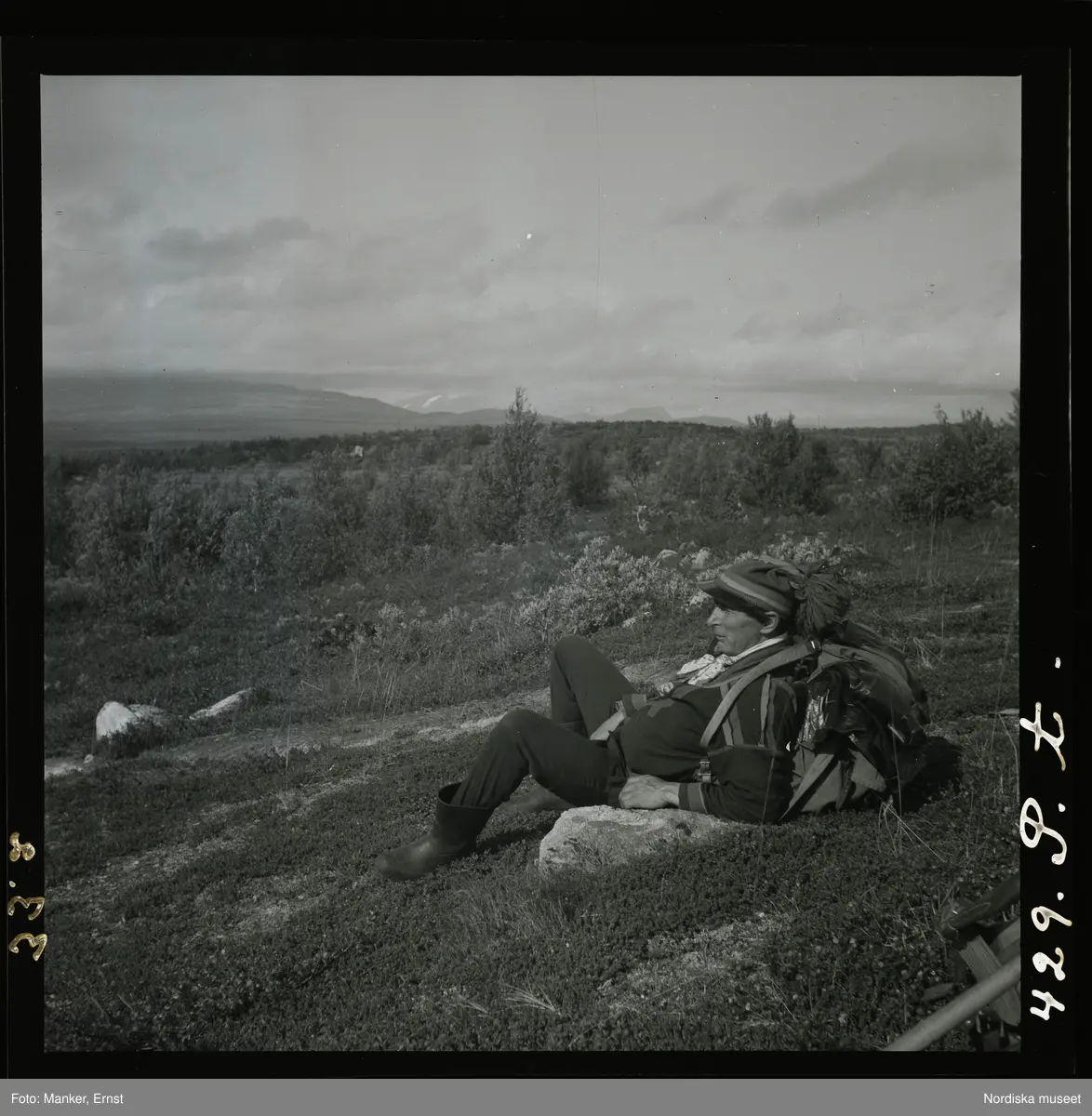 Utsikt från Kaivares sydsluttning västerut mot bl. a. Ripasasjaure. Olof Turi vilar i gräset iförd samisk dräkt.