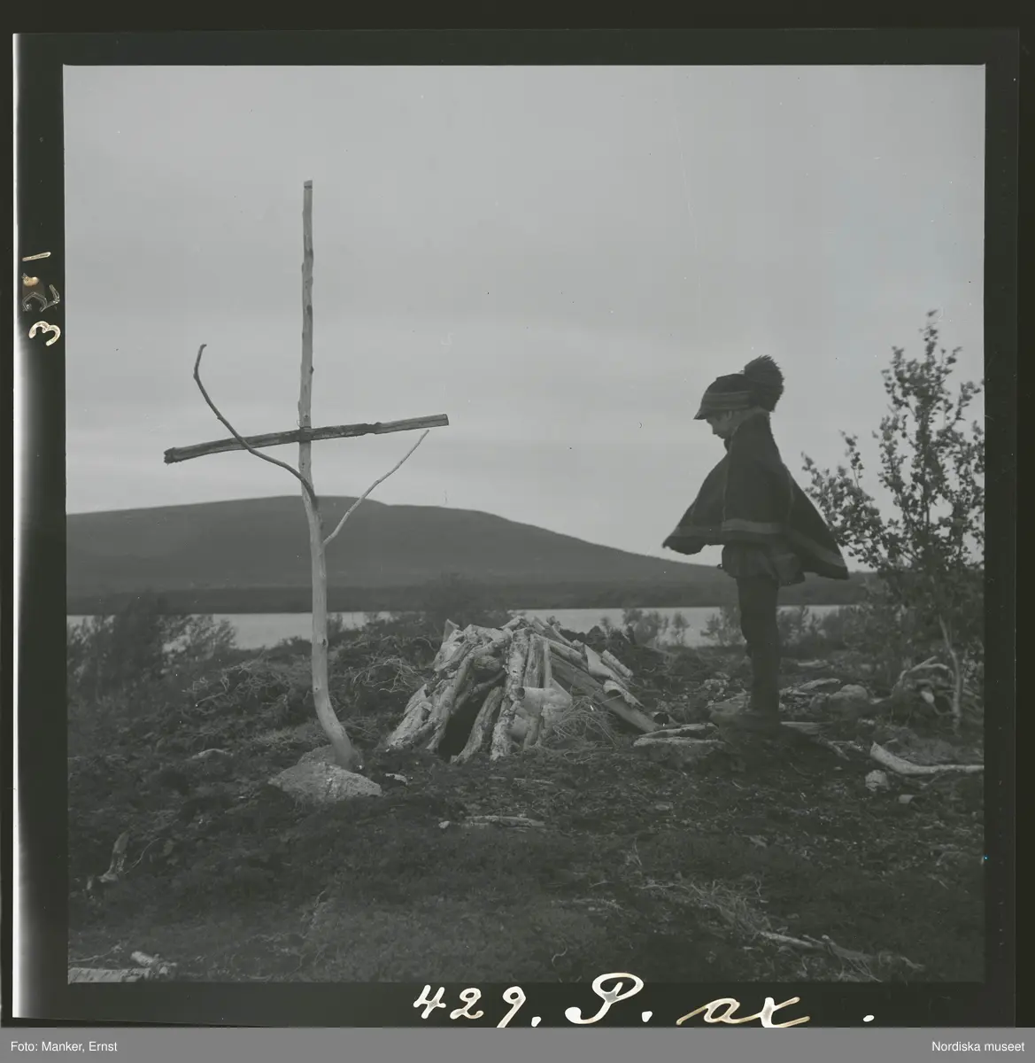 Pojke betraktar sommargrav på dödsholmen i Vuoskojaure, Jukkasjärvi sn.