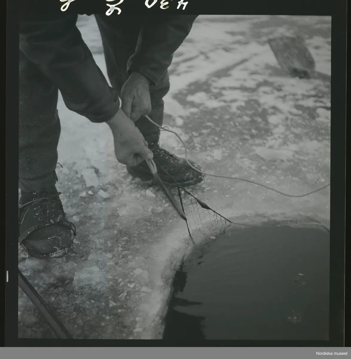 Vinterfiske på sjön. Det fiskas med nät genom hål i isen.