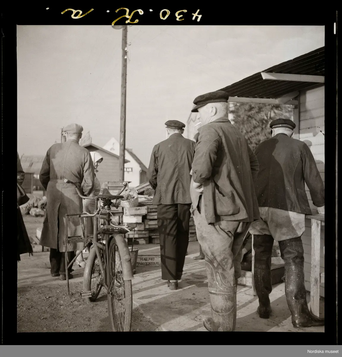 Text på montering i arkivet: På kajen halv 7 på morgonen i väntan på fiskebåtarna. Fiskförsäljerskor vid skjulet "Fiskarnas fiskexport".