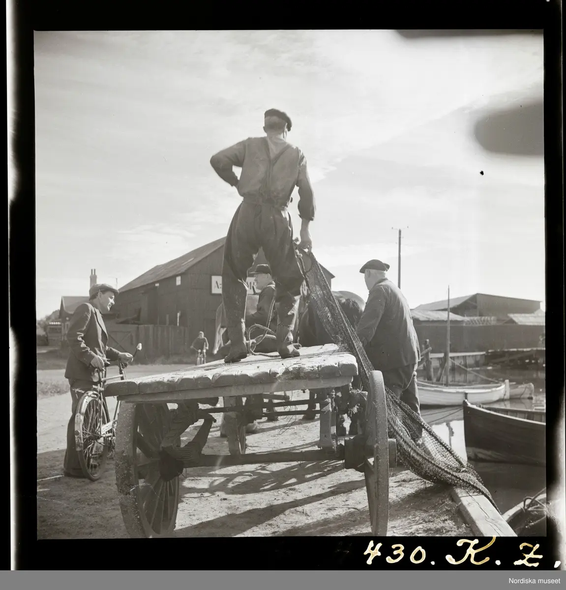 Text på montering i arkivet: Man bereder sig att hala upp det 90 famnar vida bottengarnet.