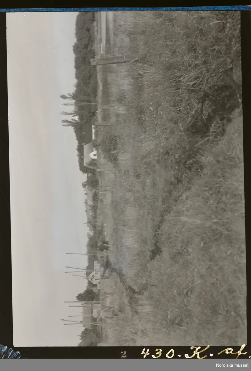 Text på montering i arkivet: Ingels vagn har kört förbi och lämnat av bottengarnen, vilka som en mörk slingrande ål ligga i gräset.