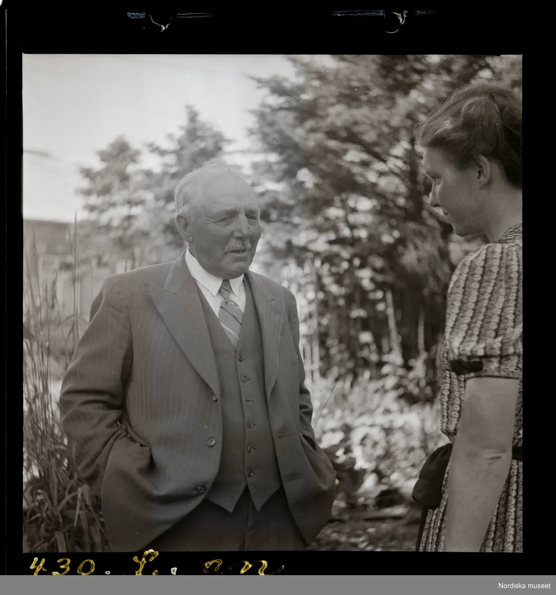 Text på montering i arkivet: Fiskaren Anders Petter Persson och kvinna i trädgården.