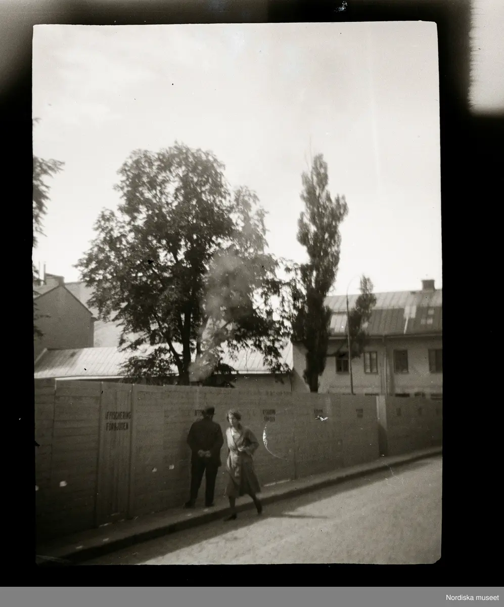 Titel: Längs en gata står ett avskärmande plank med text "Affischering förbjuden". 61/1941 Konrad Elméus