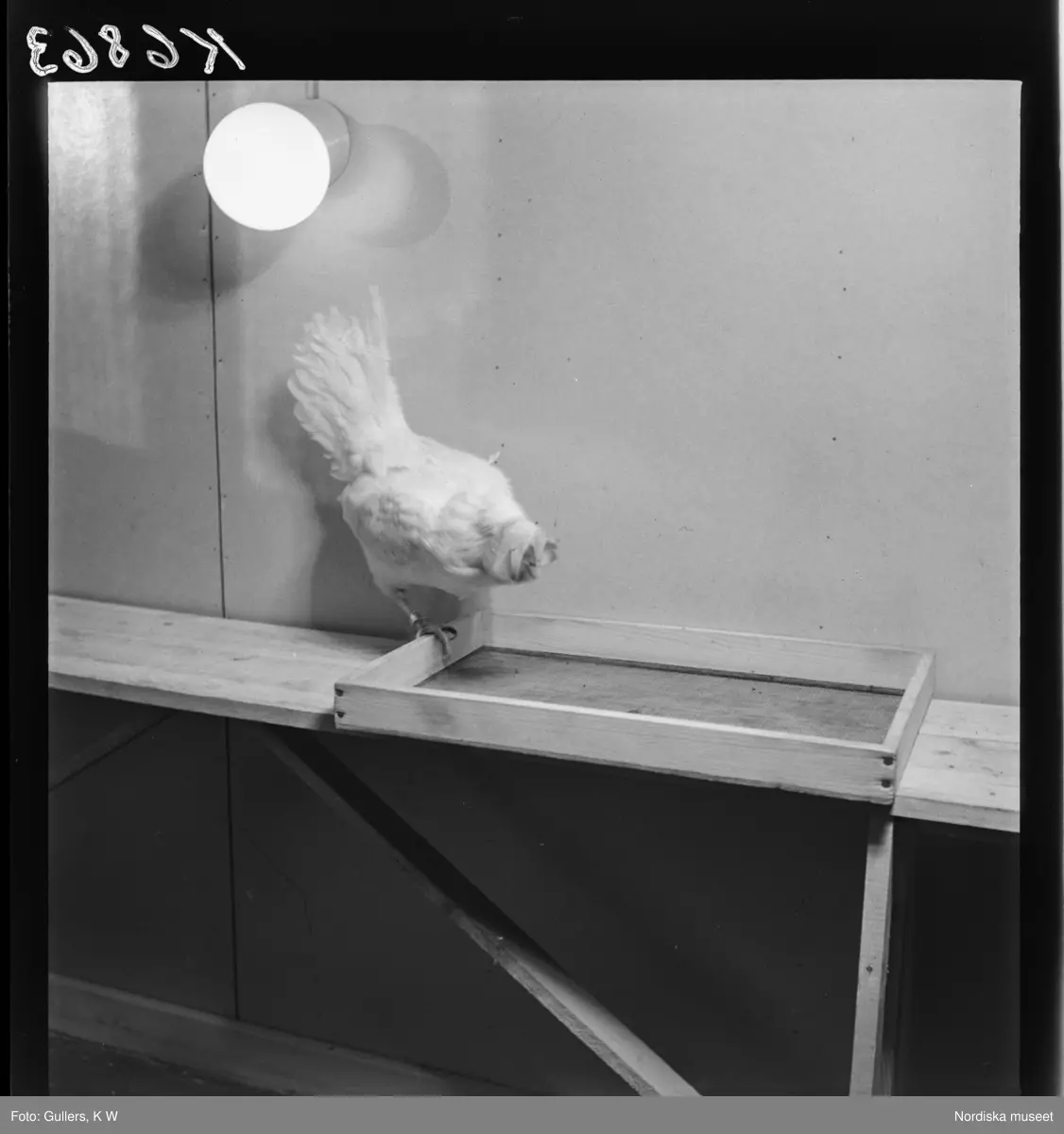 507 E Ultuna Fjäderfälaboratorium. En höna på ett bord.