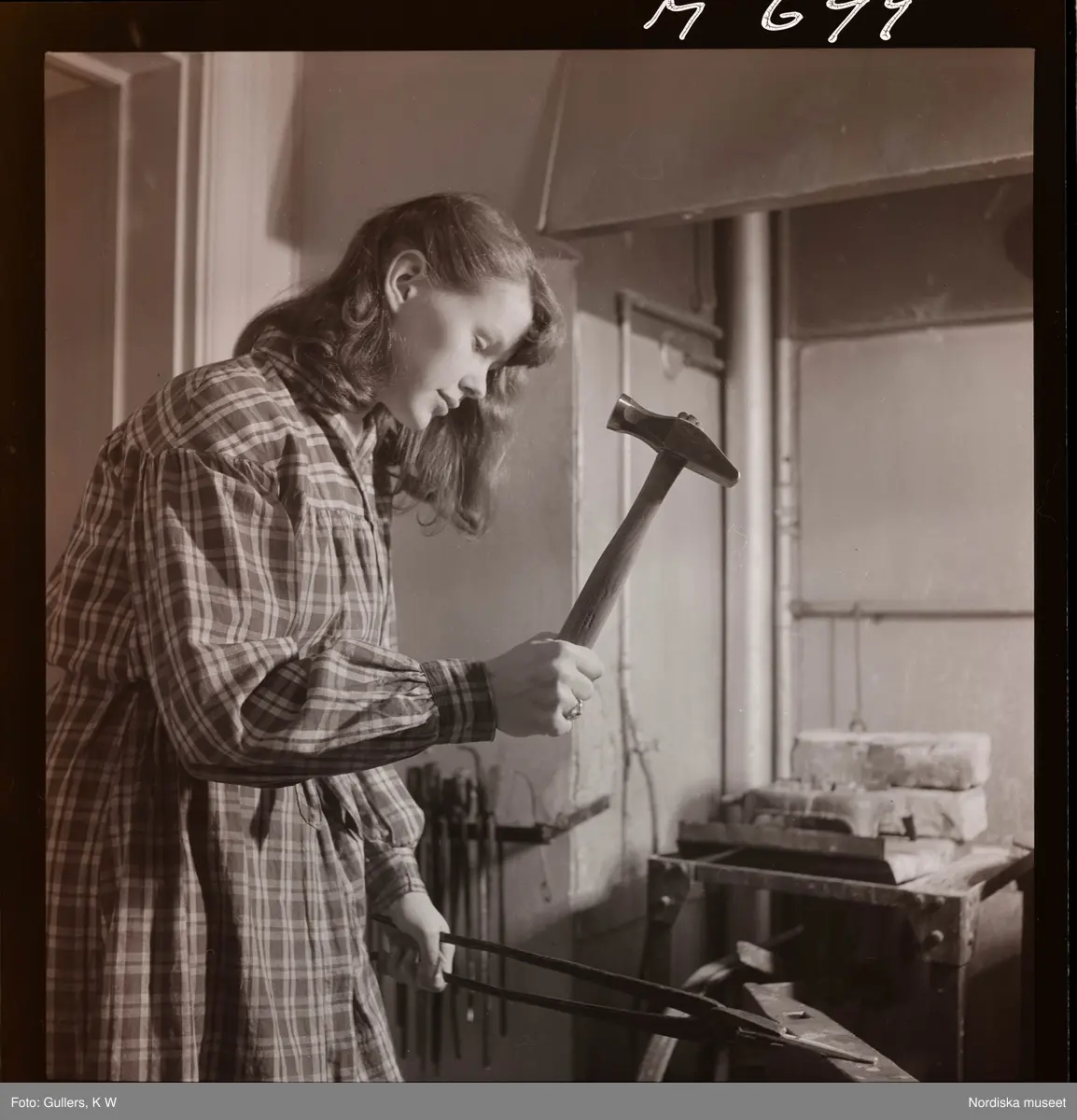 1677 Konstfackskolan. Kvinnlig elev hamrar metall.