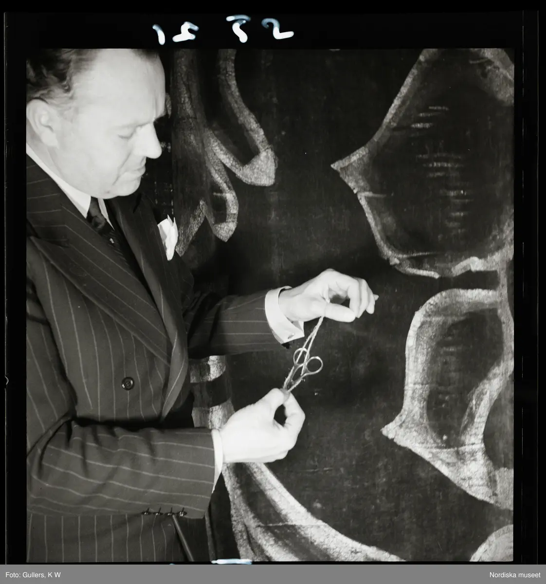 Titel: 568 Trenters reportage. En man utför trolleri-trick med en sax på snöre.