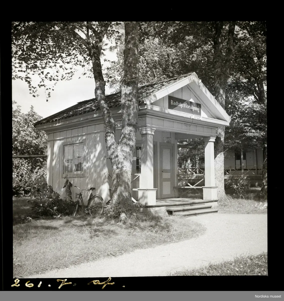 Liten byggnad, skylt ovanför dörren: Badbiljettförsäljning.Sätra brunn, Västmanland.