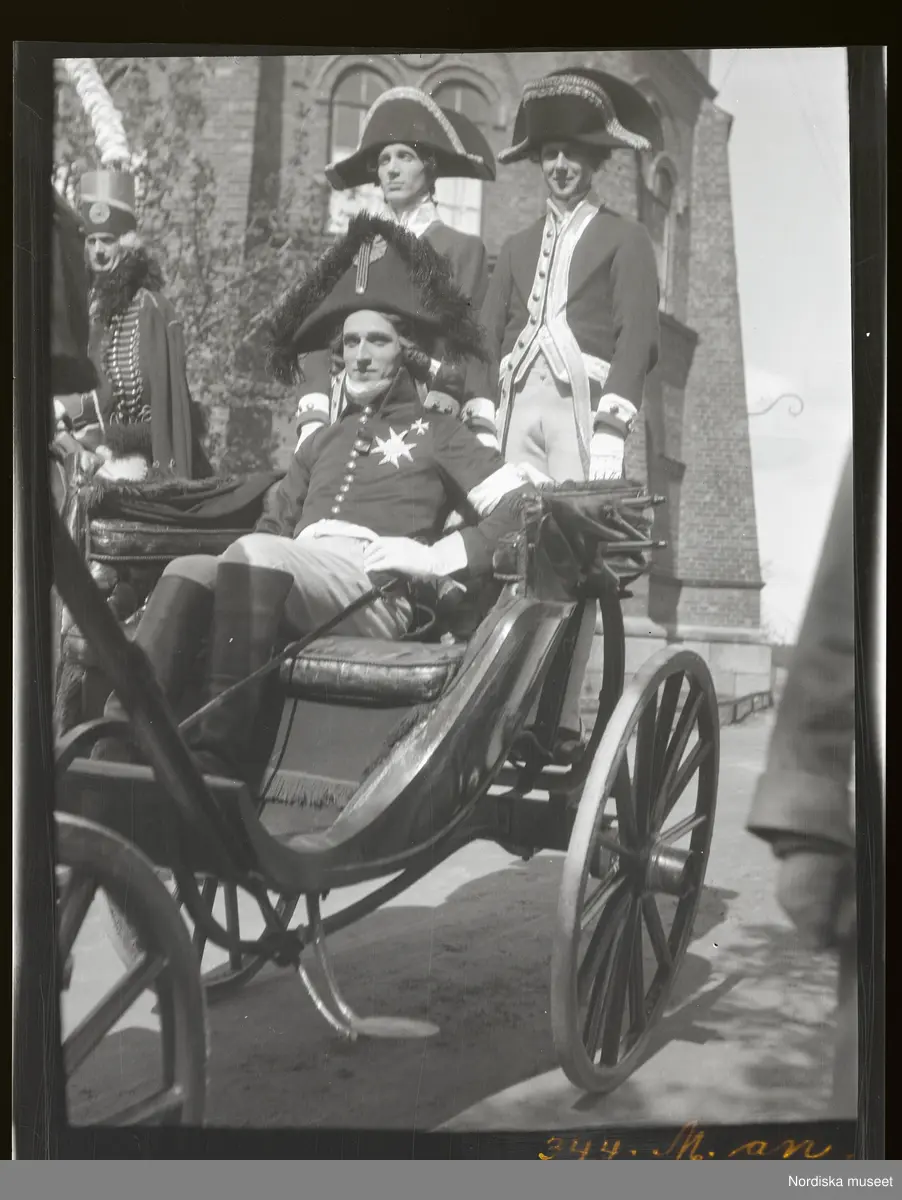 Man i äldre uniform sitter i hästdragen vagn. Skansen, Stockholm.