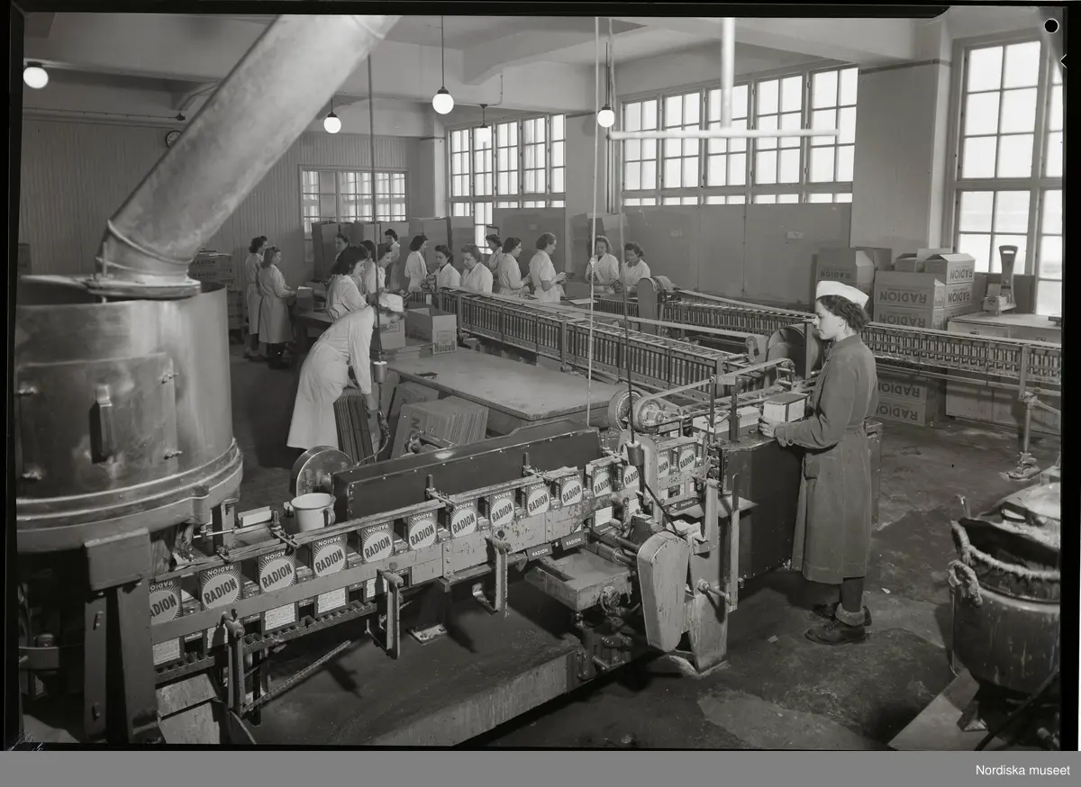Kvinnor arbetar vid ett löpande band i en fabrik där "Radion" tvättmedelsförpackningar tillverkas.