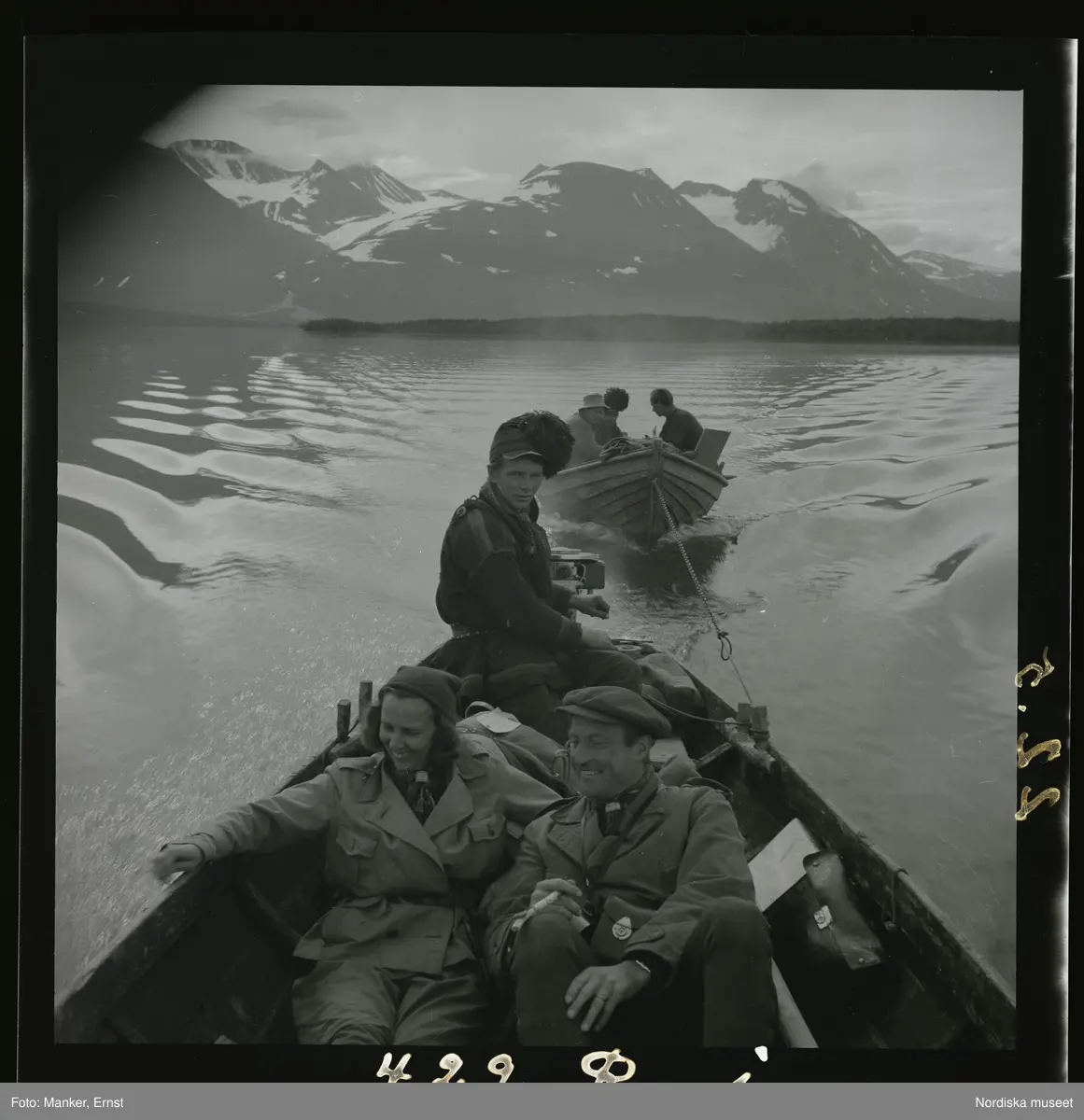 Paulus Utsi kör expeditionen över Akkajaure, Vaisaluokta i Jokkmokks socken, Lappland. Två båtar med passagerare på vattnet, i bakgrunden ses Pålnotjåkko och Akka.