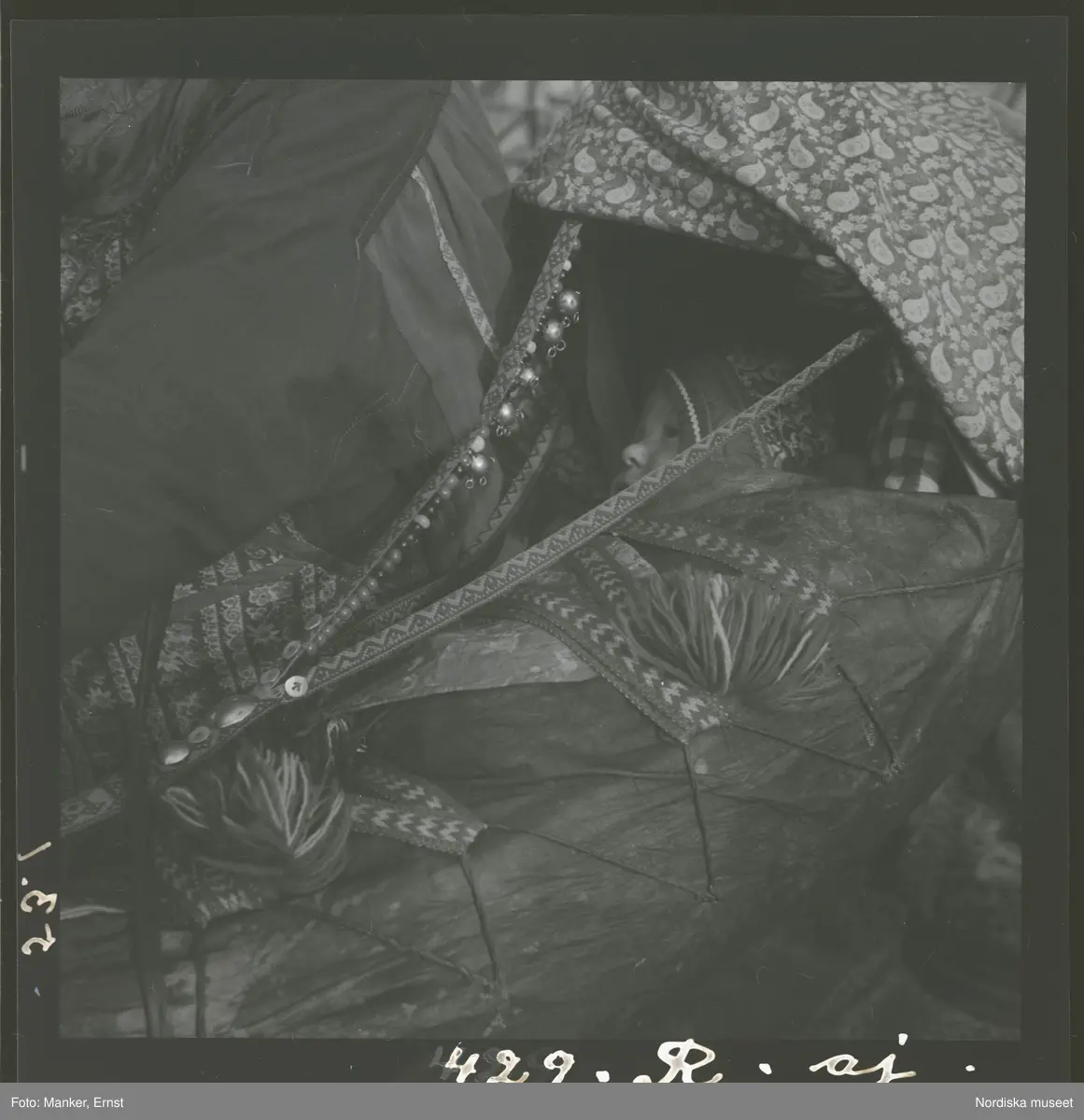 Ett litet barn ligger nedbäddad i en komsio/ geittka, en samisk vagga.