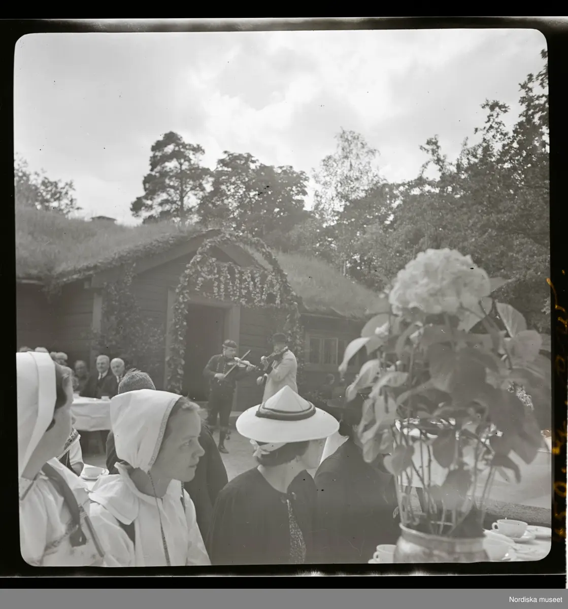 Människor under festligheter på gårdsplanen framför ett hus. Spelemän spelar. En dekoration i blommor stavar "Anna" ovanför dörren. Skansen, Stockholm.