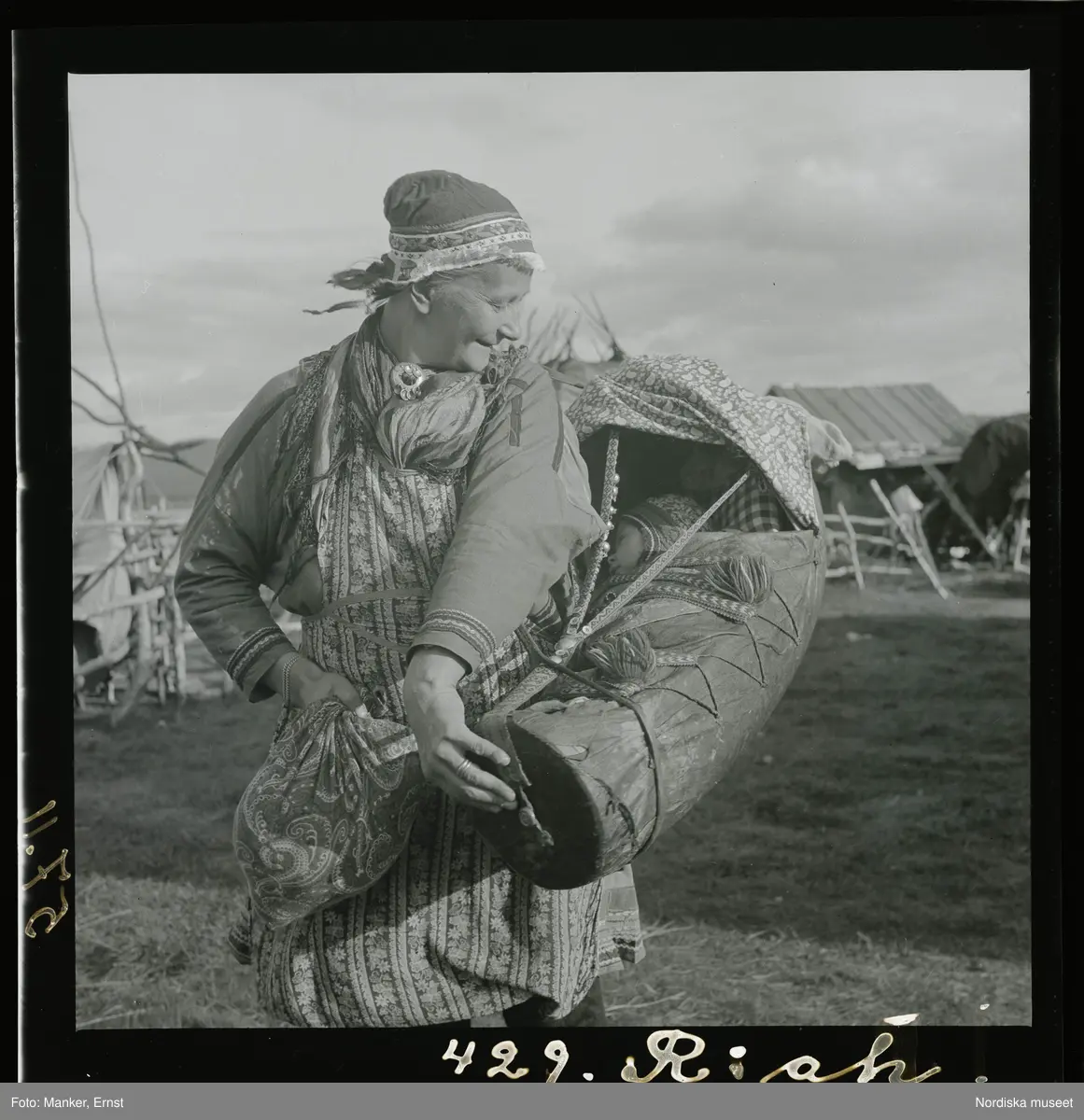 En kvinna bär en komsio/ geittka på axeln. Hon tittar leende ner på det lilla barnet som sover däri.