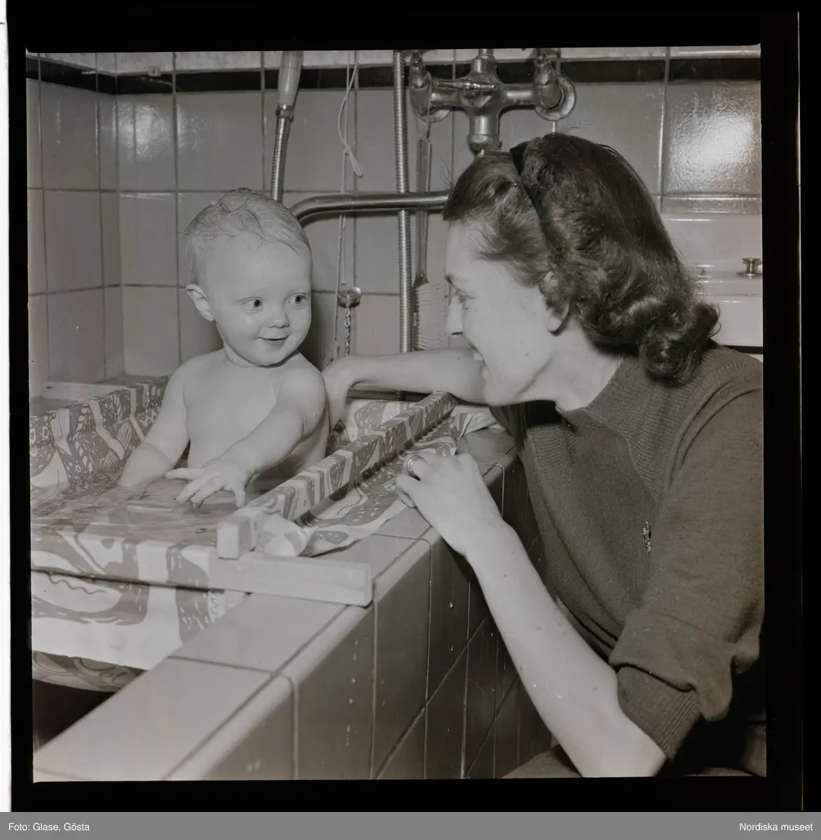 En kvinna med ett litet barn som badar badkar.