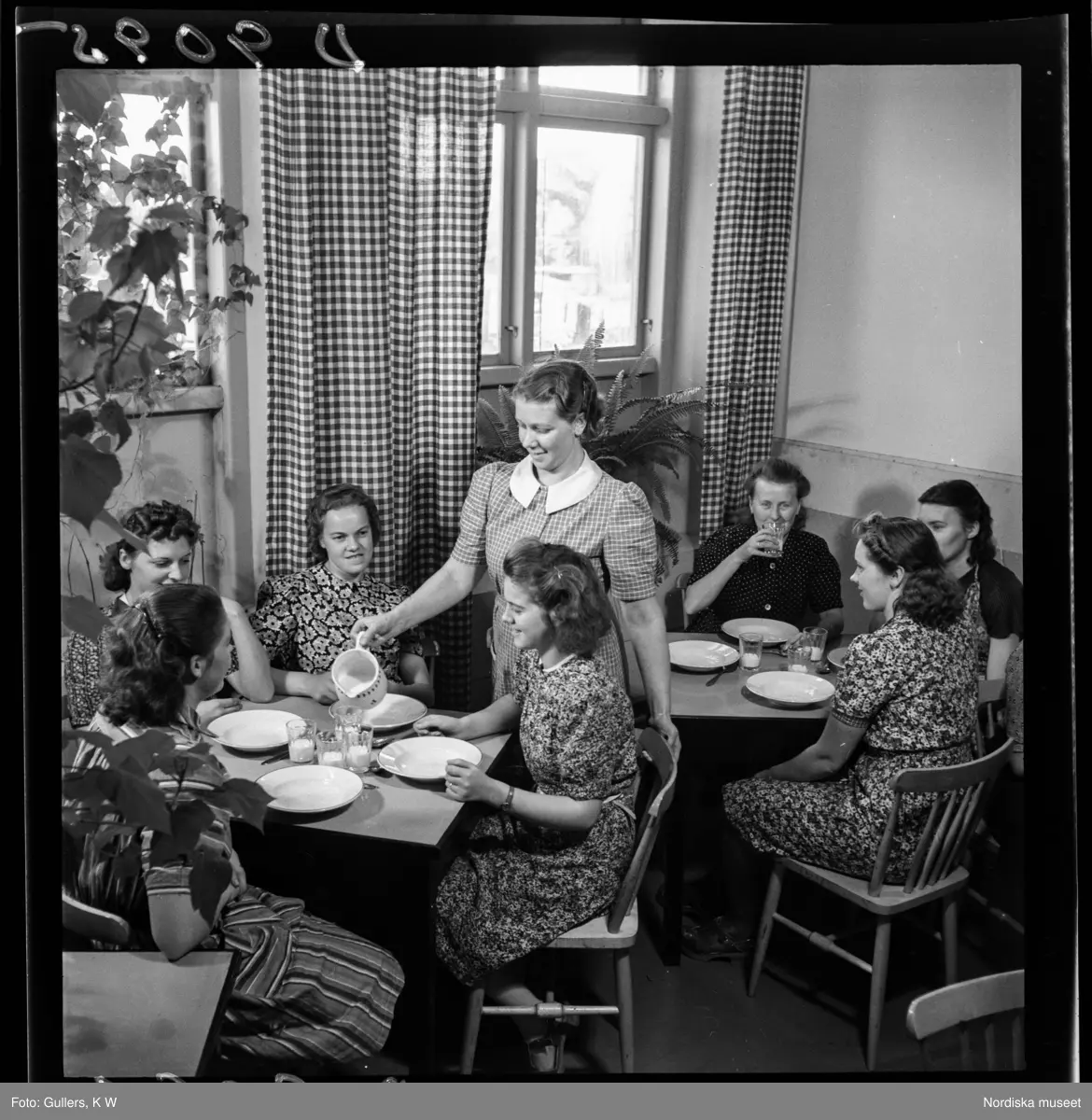 Arbete i tekoindustrin på Borås Wäfveri. Kvinnor sitter till bords i ett lunchrum.